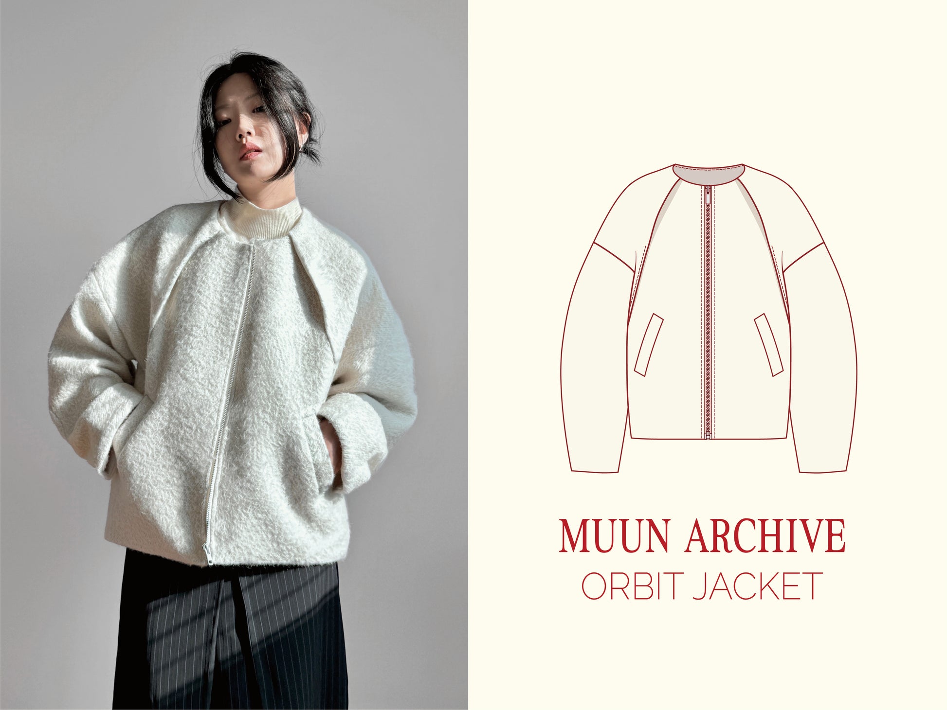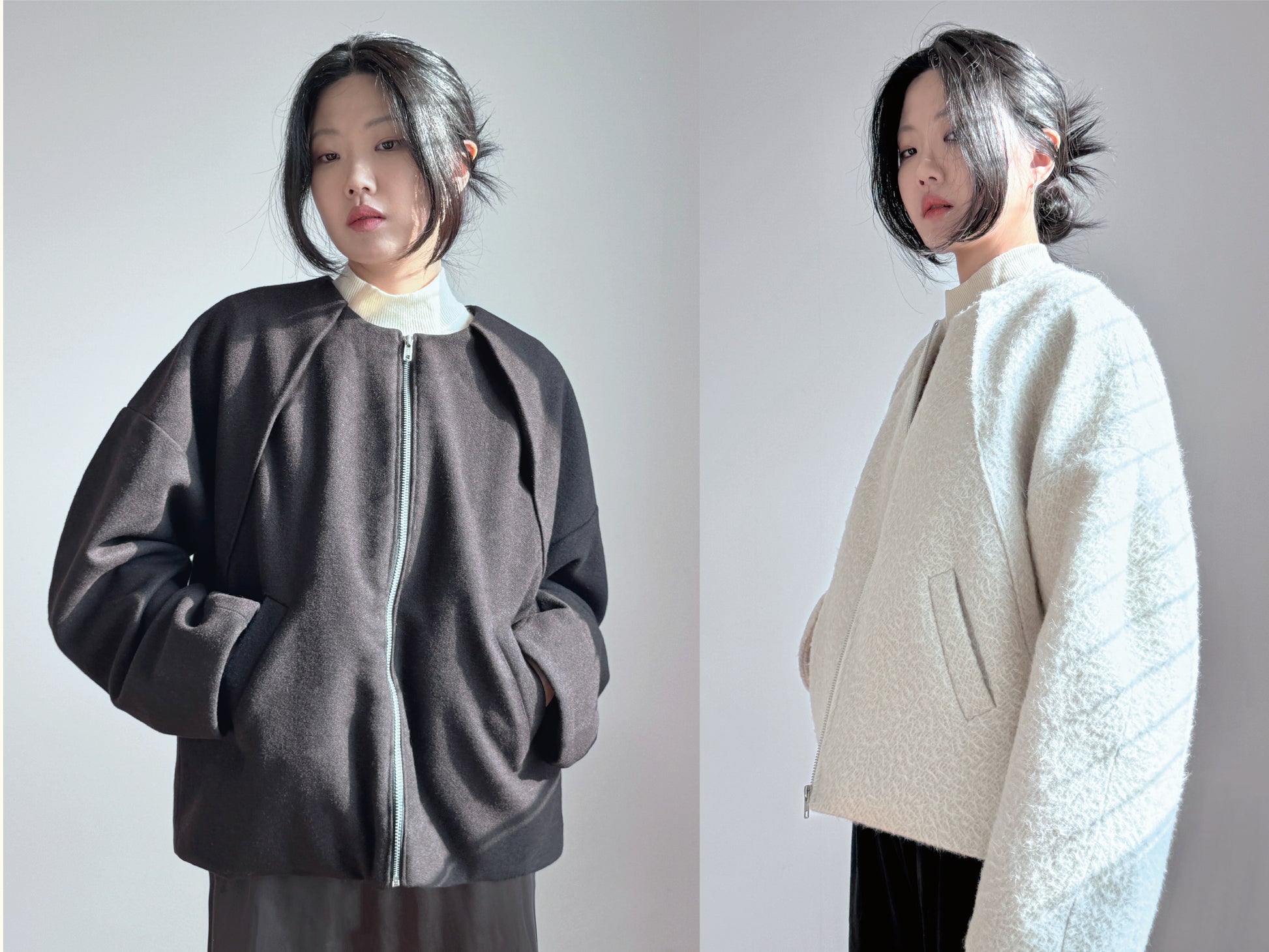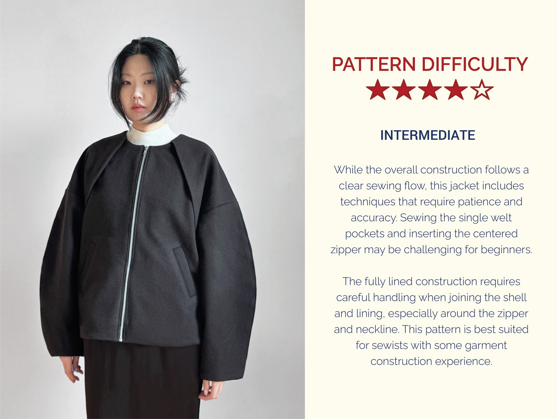 features a relaxed oversized fit designed for comfortable layering. It is finished with a centered front zipper closure and a collarless round neckline for a clean and modern look. The front bodice includes sculptural pleats that originate from the neckline and extend into the side seams, creating subtle structure and a soft faux raglan effect. The sleeves are shaped with a cocoon silhouette, adding volume while maintaining a balanced overall form. The jacket is fully lined for a clean interior finish and features single welt pockets for a refined, tailored detail.